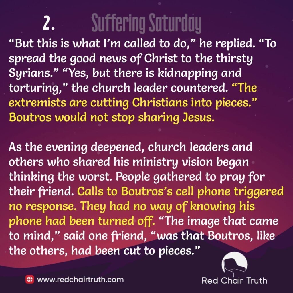 As the evening deepened, church leaders and others who shared his ministry vision began thinking the worst. People gathered to pray for their friend. Calls to Boutros’s cell phone triggered no response. They had no way of knowing his phone had been turned off. “The image that came to mind,” said one friend, “was that Boutros, like the others, had been cut to pieces.”