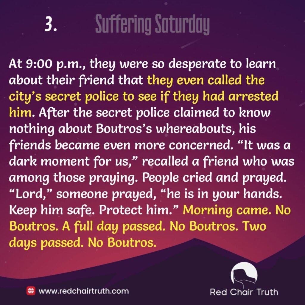 At 9:00 p.m., they were so desperate to learn about their friend that they even called the city’s secret police to see if they had arrested him. After the secret police claimed to know nothing about Boutros’s whereabouts, his friends became even more concerned. “It was a dark moment for us,” recalled a friend who was among those praying. People cried and prayed. “Lord,” someone prayed, “he is in your hands. Keep him safe. Protect him.”