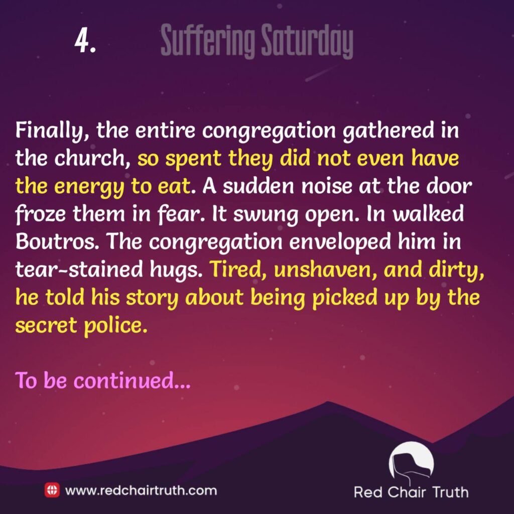 Morning came. No Boutros. A full day passed. No Boutros. Two days passed. No Boutros. Finally, the entire congregation gathered in the church, so spent they did not even have the energy to eat. A sudden noise at the door froze them in fear. It swung open. In walked Boutros. The congregation enveloped him in tear-stained hugs. Tired, unshaven, and dirty, he told his story about being picked up by the secret police.