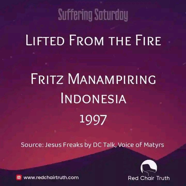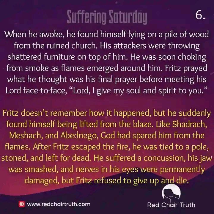 When he awoke, he found himself lying on a pile of wood from the ruined church. His attackers were throwing shattered furniture on top of him. He was soon choking from smoke as flames emerged around him. Fritz prayed what he thought was his final prayer before meeting his Lord face-to-face, “Lord, I give my soul and spirit to you.”