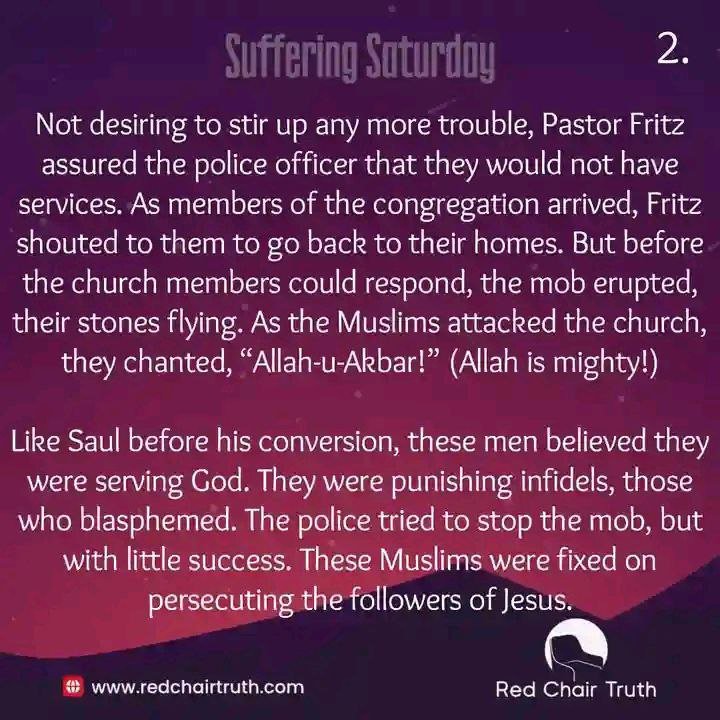 Like Saul before his conversion, these men believed they were serving God. They were punishing infidels, those who blasphemed. The police tried to stop the mob, but with little success. These Muslims were fixed on persecuting the followers of Jesus.