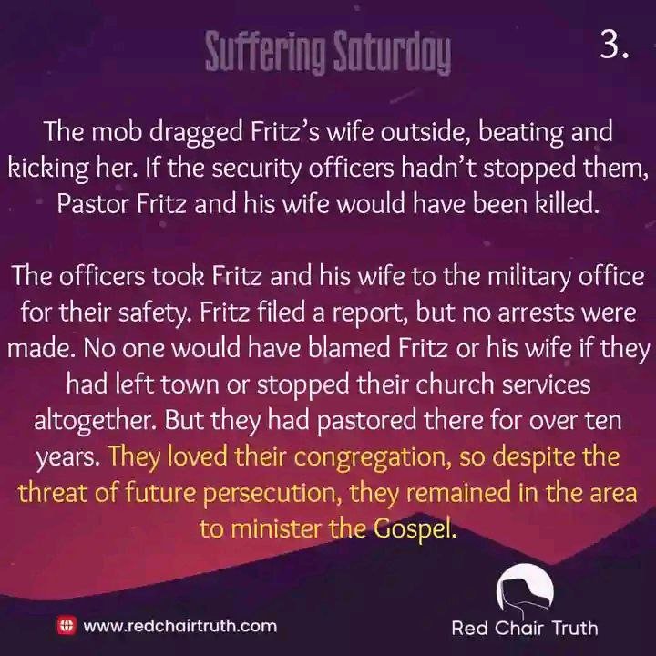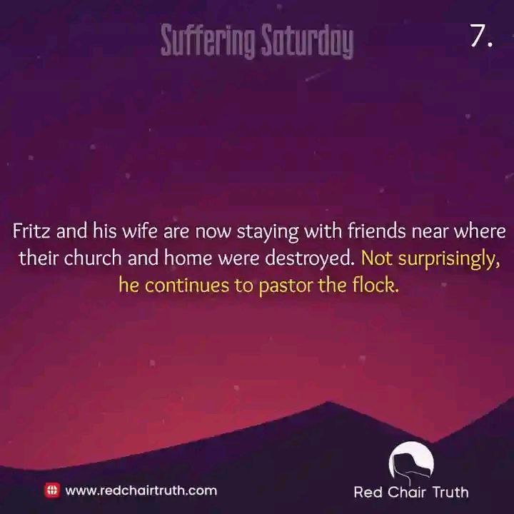 Fritz and his wife are now staying with friends near where their church and home were destroyed. Not surprisingly, he continues to pastor the flock. They have conquered him by the blood of the Lamb and by the word of their testimony. And they did not love their lives so as to shy away from death. Revelation 12:11