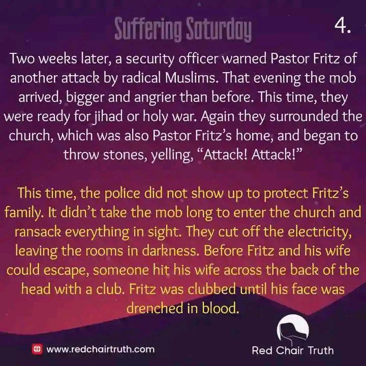 Two weeks later, a security officer warned Pastor Fritz of another attack by radical Muslims. That evening the mob arrived, bigger and angrier than before. This time, they were ready for jihad or holy war. Again they surrounded the church, which was also Pastor Fritz’s home, and began to throw stones, yelling, “Attack! Attack!”
