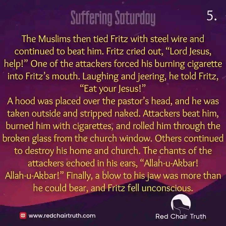 The Muslims then tied Fritz with steel wire and continued to beat him. Fritz cried out, “Lord Jesus, help!” One of the attackers forced his burning cigarette into Fritz’s mouth. Laughing and jeering, he told Fritz, “Eat your Jesus!”