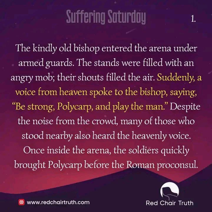 Polycarp, the well-known Bishop of Smyrna, was the last living link with the twelve apostles, as he had studied under John. As soon as the crowd learned that this famous bishop had been arrested, a great cheer went up.