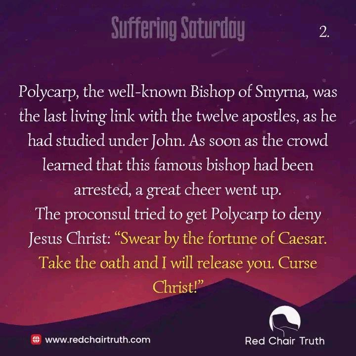 The proconsul tried to get Polycarp to deny Jesus Christ: “Swear by the fortune of Caesar. Take the oath and I will release you. Curse Christ!”