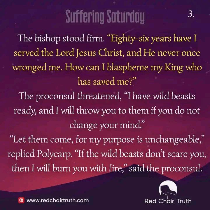 The bishop stood firm. “Eighty-six years have I served the Lord Jesus Christ, and He never once wronged me. How can I blaspheme my King who has saved me?” The proconsul threatened, “I have wild beasts ready, and I will throw you to them if you do not change your mind.”