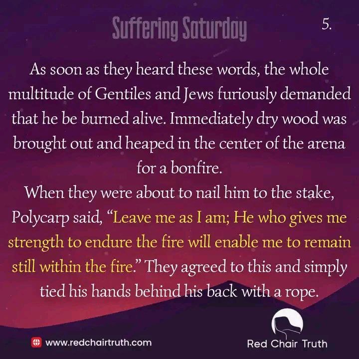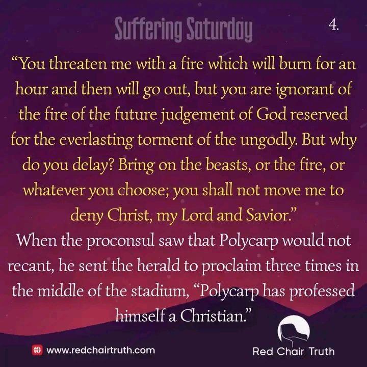 “You threaten me with a fire which will burn for an hour and then will go out, but you are ignorant of the fire of the future judgement of God reserved for the everlasting torment of the ungodly. But why do you delay? Bring on the beasts, or the fire, or whatever you choose; you shall not move me to deny Christ, my Lord and Savior.”