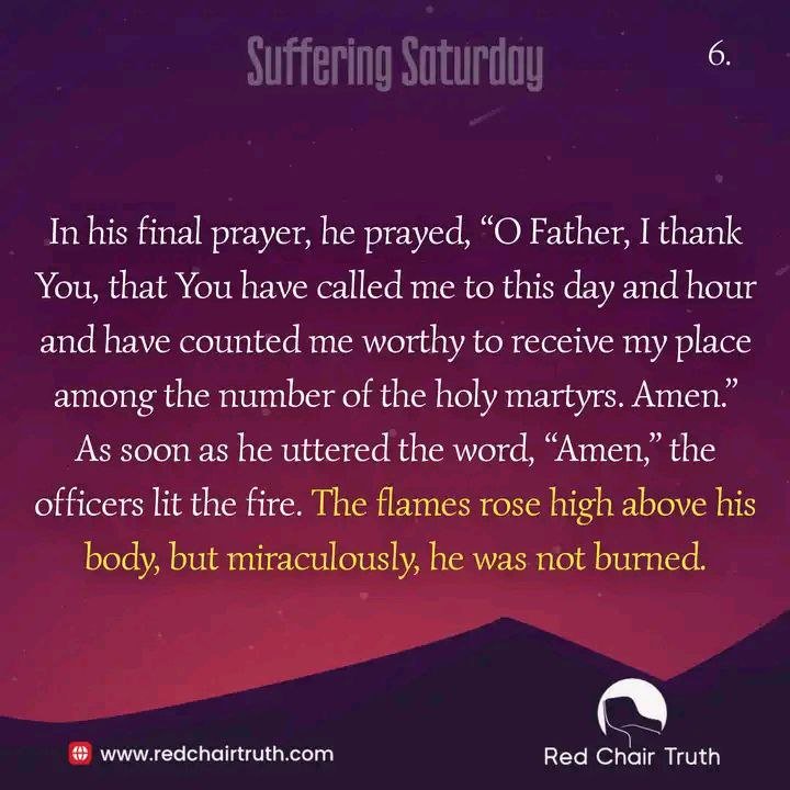 In his final prayer, he prayed, “O Father, I thank You, that You have called me to this day and hour and have counted me worthy to receive my place among the number of the holy martyrs. Amen.” As soon as he uttered the word, “Amen,” the officers lit the fire. The flames rose high above his body, but miraculously, he was not burned.