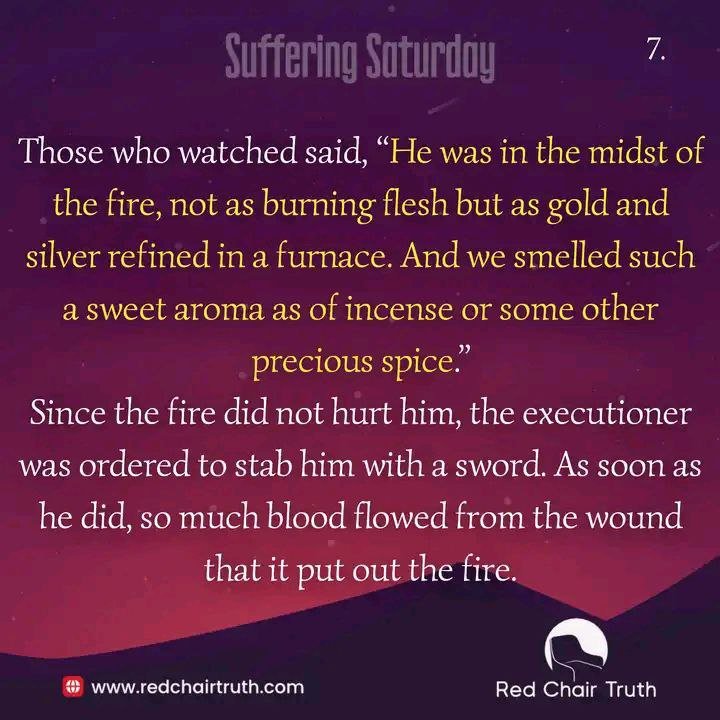 Since the fire did not hurt him, the executioner was ordered to stab him with a sword. As soon as he did, so much blood flowed from the wound that it put out the fire.