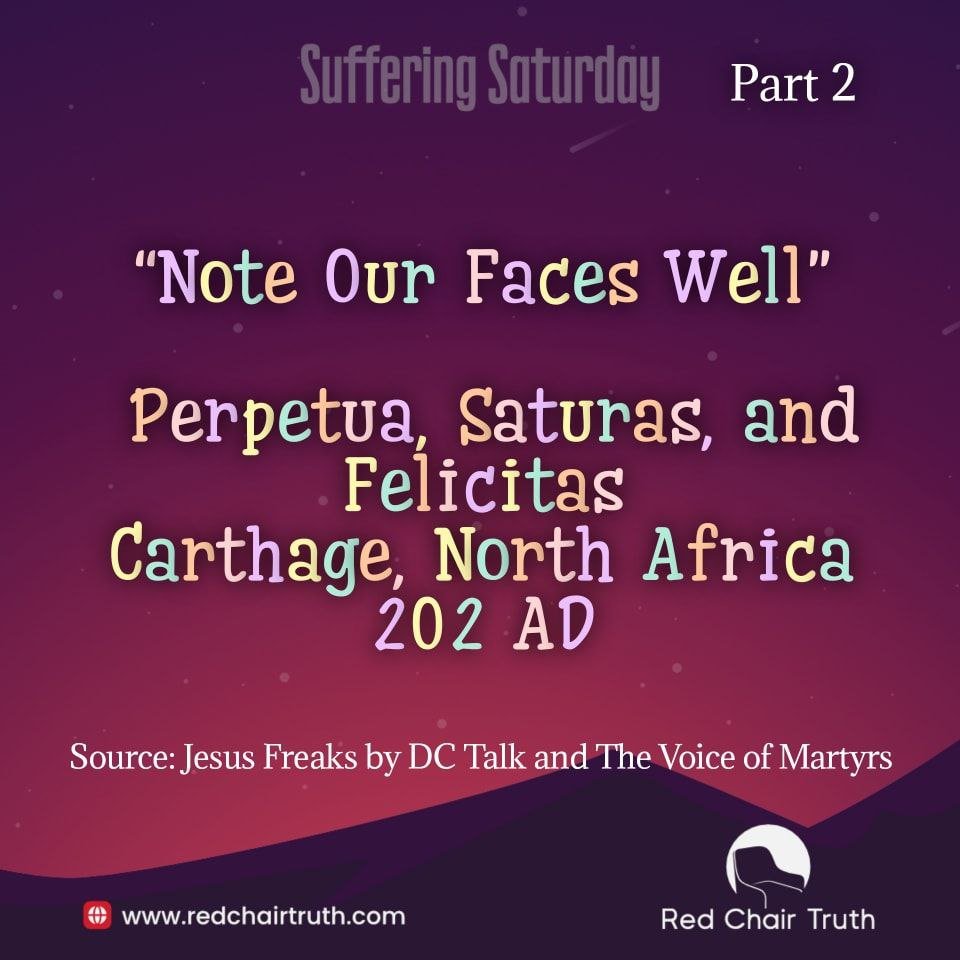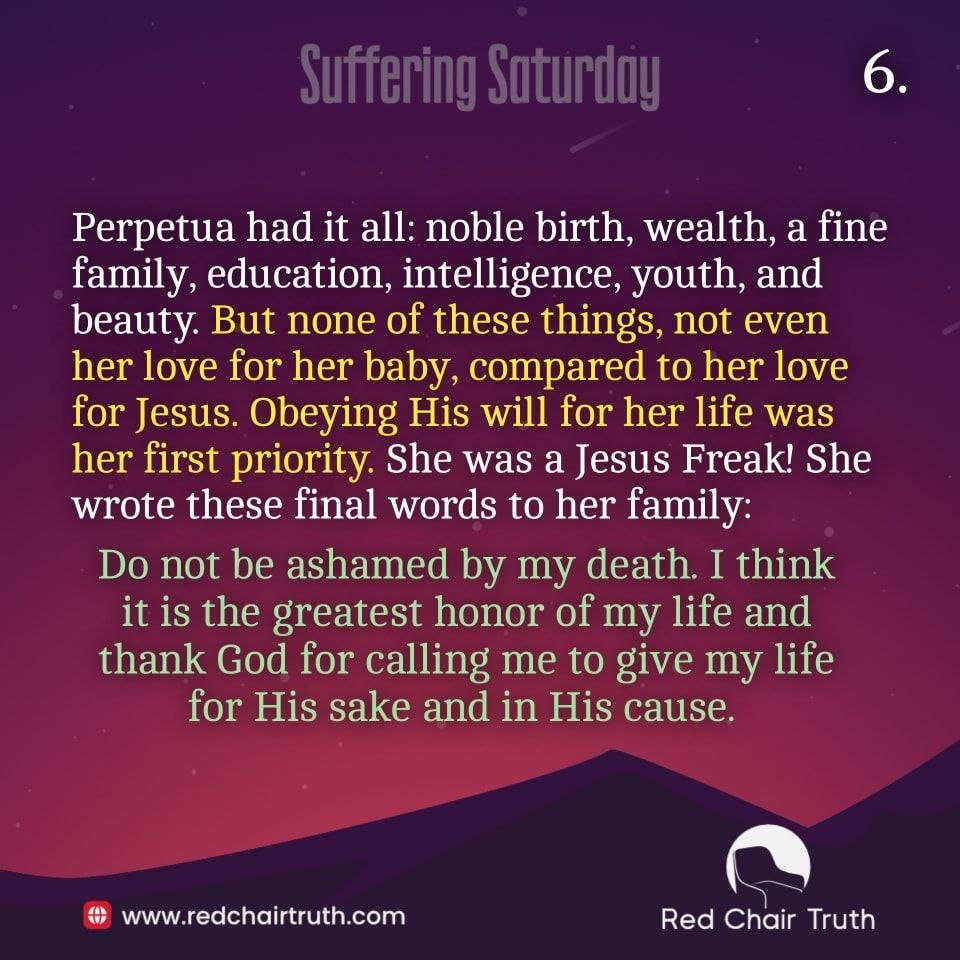 Perpetua had it all: noble birth, wealth, a fine family, education, intelligence, youth, and beauty. But none of these things, not even her love for her baby, compared to her love for Jesus. Obeying His will for her life was her first priority. She was a Jesus Freak! She wrote these final words to her family: