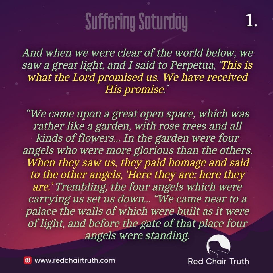 And when we were clear of the world below, we saw a great light, and I said to Perpetua, “This is what the Lord promised us. We have received His promise.’ “We came upon a great open space, which was rather like a garden, with rose trees and all kinds of flowers… In the garden were four angels who were more glorious than the others. When they saw us, they paid homage and said to the other angels, ‘Here they are; here they are.’ Trembling, the four angels which were carrying us set us down… “We came near to a palace the walls of which were built as it were of light, and before the gate of that place four angels were standing.