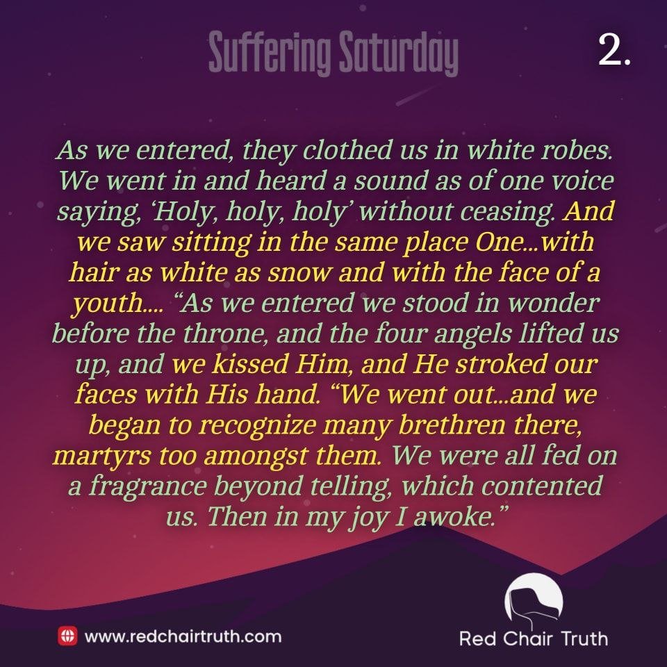 As we entered, they clothed us in white robes. We went in and heard a sound as of one voice saying, ‘Holy, holy, holy’ without ceasing. And we saw sitting in the same place One…with hair as white as snow and with the face of a youth…. “As we entered we stood in wonder before the throne, and the four angels lifted us up, and we kissed Him, and He stroked our faces with His hand. “We went out…and we began to recognize many brethren there, martyrs too amongst them. We were all fed on a fragrance beyond telling, which contented us. Then in my joy I awoke.