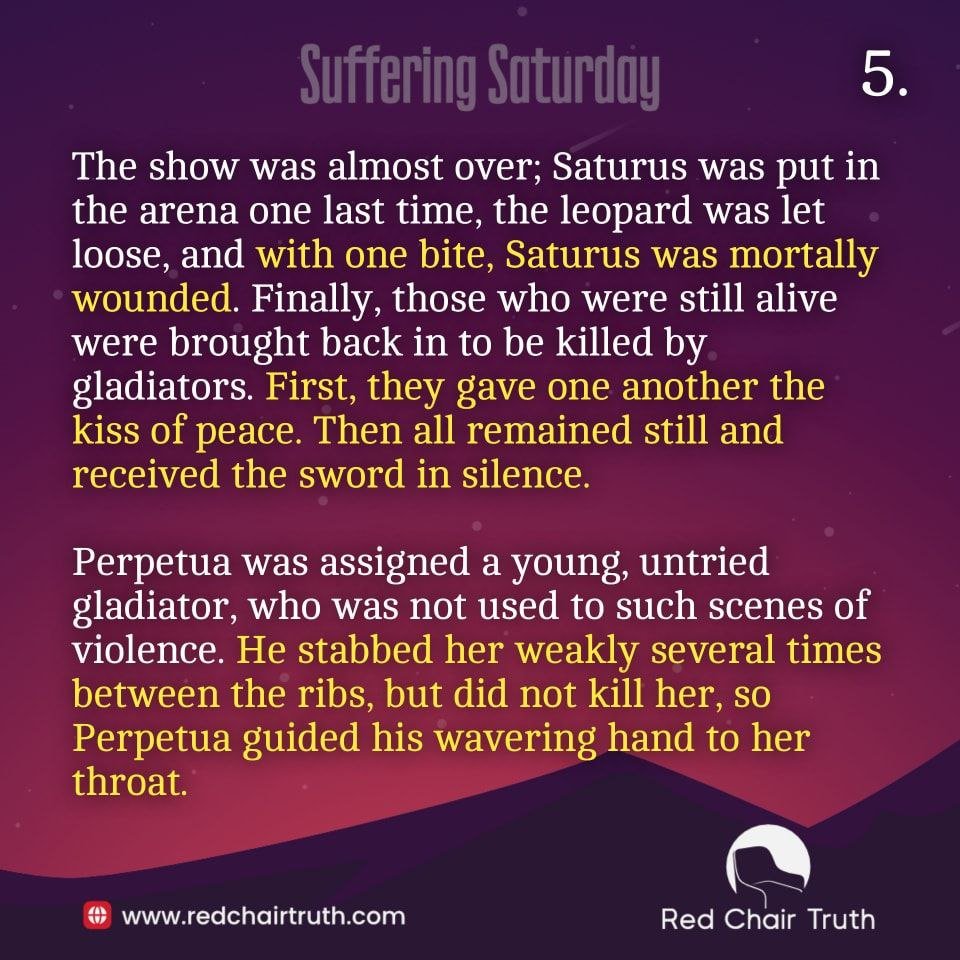 The show was almost over; Saturus was put in the arena one last time, the leopard was let loose, and with one bite, Saturus was mortally wounded. Finally, those who were still alive were brought back in to be killed by gladiators. First, they gave one another the kiss of peace. Then all remained still and received the sword in silence.