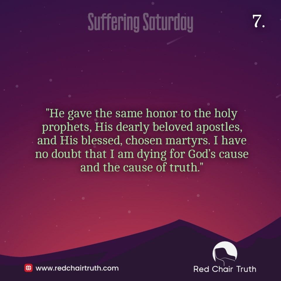 Do not be ashamed by my death. I think it is the greatest honor of my life and thank God for calling me to give my life for His sake and in His cause. “He gave the same honor to the holy prophets, His dearly beloved apostles, and His blessed, chosen martyrs. I have no doubt that I am dying for God’s cause and the cause of truth.”