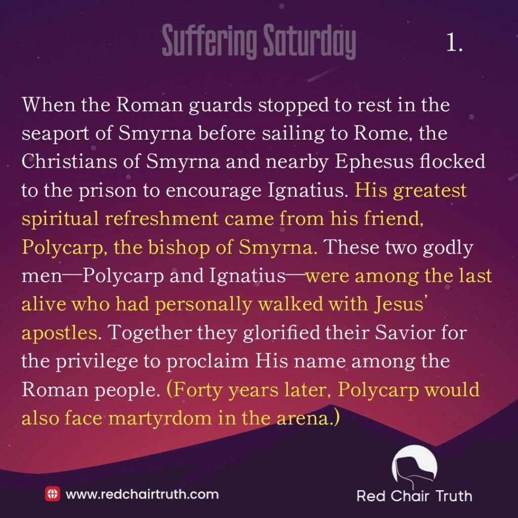 When the Roman guards stopped to rest in the seaport of Smyrna before sailing to Rome, the Christians of Smyrna and nearby Ephesus flocked to the prison to encourage Ignatius. His greatest spiritual refreshment came from his friend, Polycarp, the bishop of Smyrna. These two godly men—Polycarp and Ignatius—were among the last alive who had personally walked with Jesus’ apostles. Together they glorified their Savior for the privilege to proclaim His name among the Roman people. (Forty years later, Polycarp would also face martyrdom in the arena.)