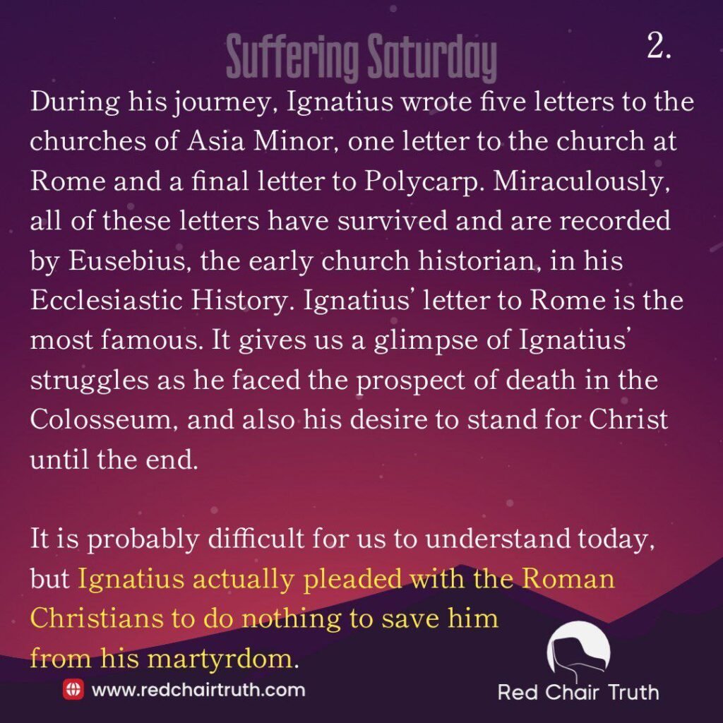 During his journey, Ignatius wrote five letters to the churches of Asia Minor, one letter to the church at Rome and a final letter to Polycarp. Miraculously, all of these letters have survived and are recorded by Eusebius, the early church historian, in his Ecclesiastic History. Ignatius’ letter to Rome is the most famous. It gives us a glimpse of Ignatius’ struggles as he faced the prospect of death in the Colosseum, and also his desire to stand for Christ until the end.