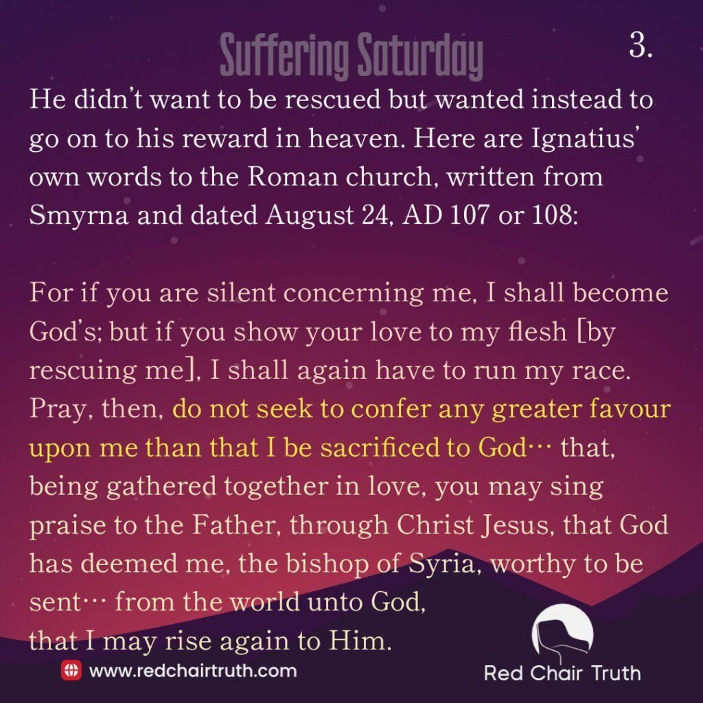 It is probably difficult for us to understand today, but Ignatius actually pleaded with the Roman Christians to do nothing to save him from his martyrdom. He didn’t want to be rescued but wanted instead to go on to his reward in heaven. Here are Ignatius’ own words to the Roman church, written from Smyrna and dated August 24, AD 107 or 108: