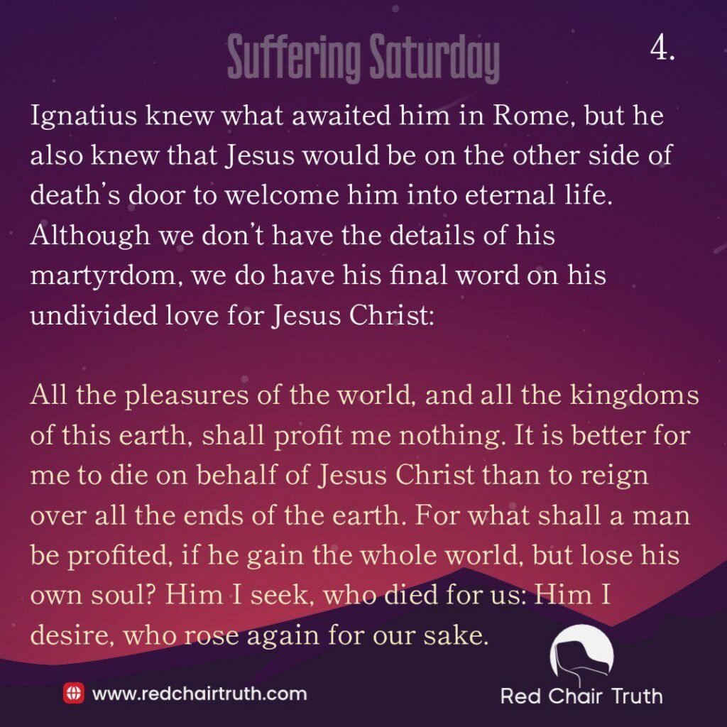 For if you are silent concerning me, I shall become God’s; but if you show your love to my flesh [by rescuing me], I shall again have to run my race. Pray, then, do not seek to confer any greater favour upon me than that I be sacrificed to God… that, being gathered together in love, you may sing praise to the Father, through Christ Jesus, that God has deemed me, the bishop of Syria, worthy to be sent… from the world unto God, that I may rise again to Him. Ignatius knew what awaited him in Rome, but he also knew that Jesus would be on the other side of death’s door to welcome him into eternal life.