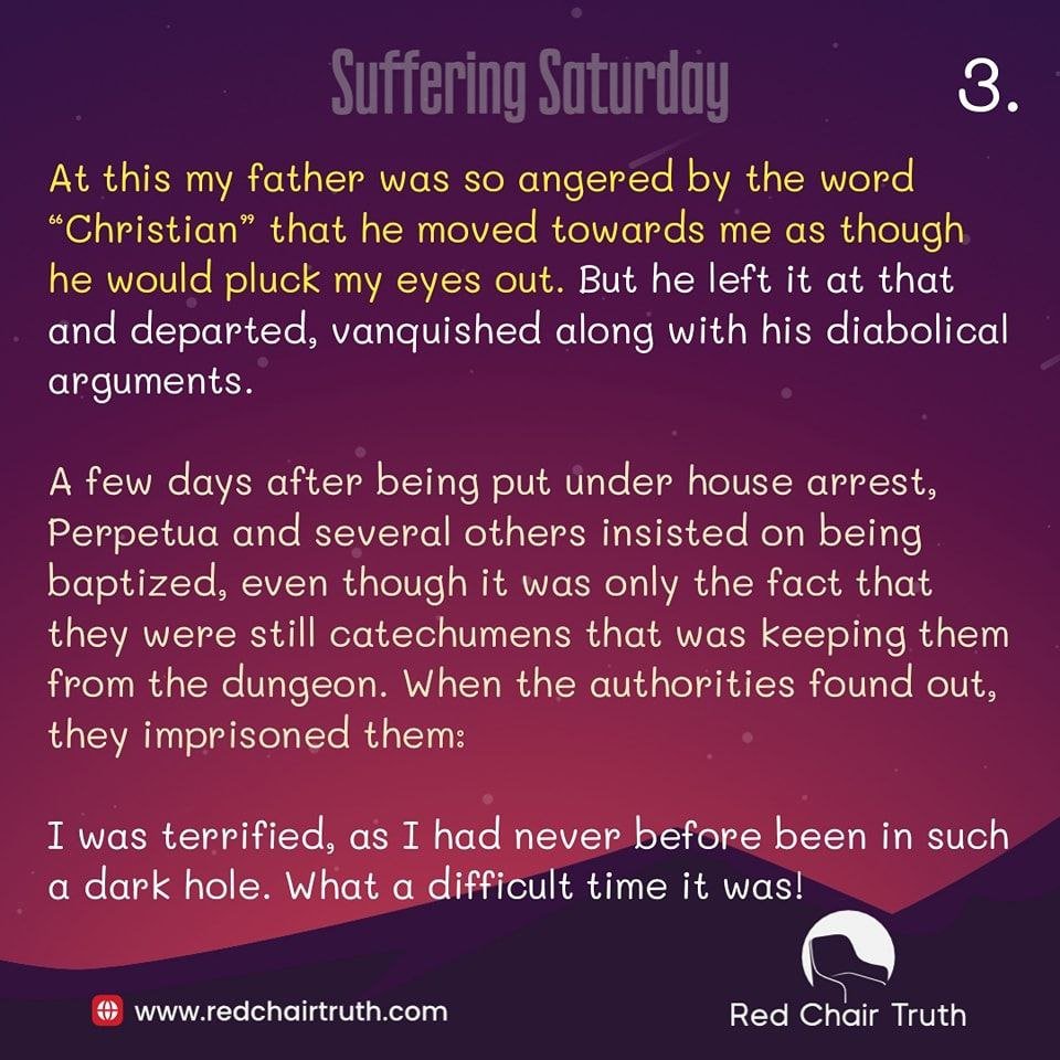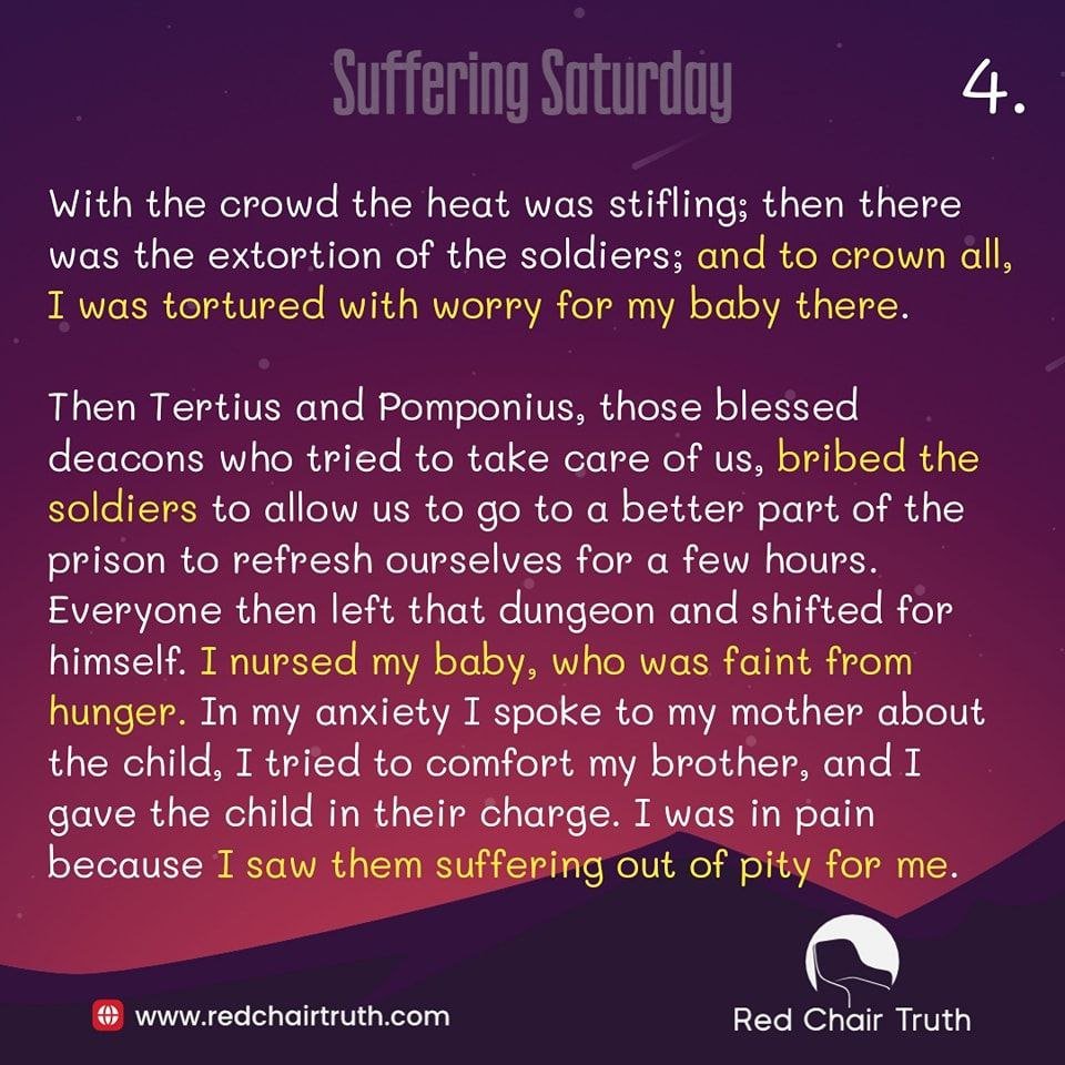 A few days after being put under house arrest, Perpetua and several others insisted on being baptized, even though it was only the fact that they were still catechumens that was keeping them from the dungeon. When the authorities found out, they imprisoned them: I was terrified, as I had never before been in such a dark hole. What a difficult time it was! With the crowd the heat was stifling; then there was the extortion of the soldiers; and to crown all, I was tortured with worry for my baby there.