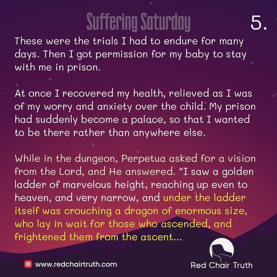 While in the dungeon, Perpetua asked for a vision from the Lord, and He answered. “I saw a golden ladder of marvelous height, reaching up even to heaven, and very narrow, and under the ladder itself was crouching a dragon of enormous size, who lay in wait for those who ascended, and frightened them from the ascent… And I said, ‘In the name of the Lord Jesus Christ, he shall not hurt me. And from under the ladder itself, as if in fear of me, he slowly lifted up his head; and as I trod upon the first step, I trod upon his head!” After that, her vision ended with a welcome from a white-haired man into a beautiful field—it was heaven. The interpretation of this vision was clear to Perpetua. Their imprisonment was going to result in torture and death for their faith. Yet, they would be blessed with the power to trample the head of the dragon (Satan) as true confessors of Jesus Christ—and they would be received with welcoming arms by the Great Shepherd and the saints waiting for them in heaven.