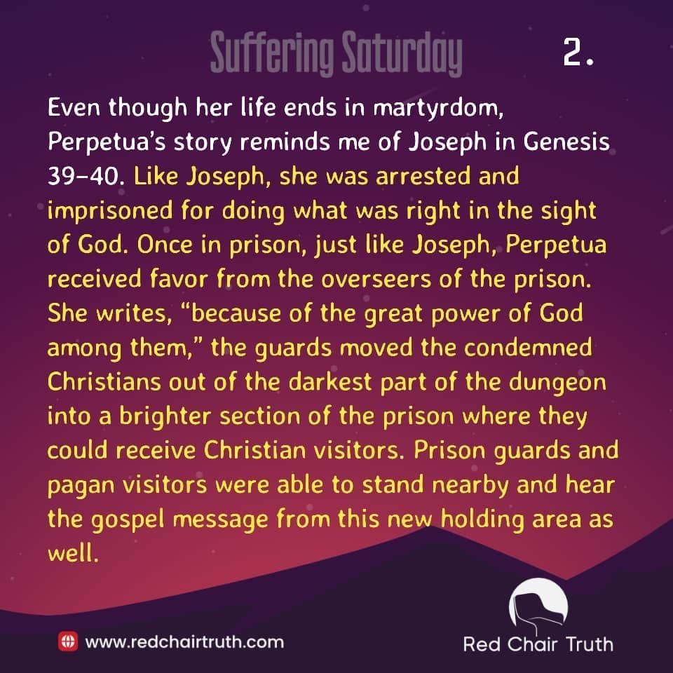 Even though her life ends in martyrdom, Perpetua’s story reminds me of Joseph in Genesis 39-40. Like Joseph, she was arrested and imprisoned for doing what was right in the sight of God. Once in prison, just like Joseph, Perpetua received favor from the overseers of the prison. She writes, “because of the great power of God among them,” the guards moved the condemned Christians out of the darkest part of the dungeon into a brighter section of the prison where they could receive Christian visitors. Prison guards and pagan visitors were able to stand nearby and hear the gospel message from this new holding area as well.