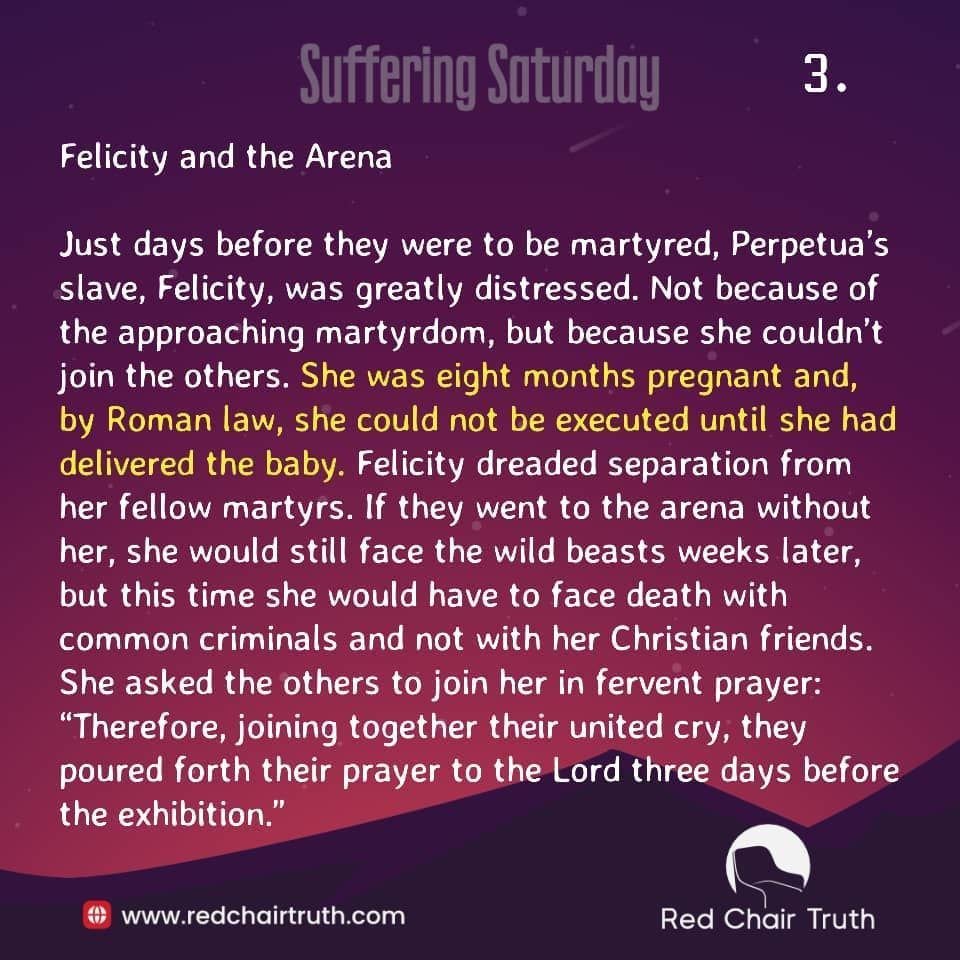 Just days before they were to be martyred, Perpetua’s slave, Felicity, was greatly distressed. Not because of the approaching martyrdom, but because she couldn’t join the others. She was eight months pregnant and, by Roman law, she could not be executed until she had delivered the baby. Felicity dreaded separation from her fellow martyrs. If they went to the arena without her, she would still face the wild beasts weeks later, but this time she would have to face death with common criminals and not with her Christian friends.