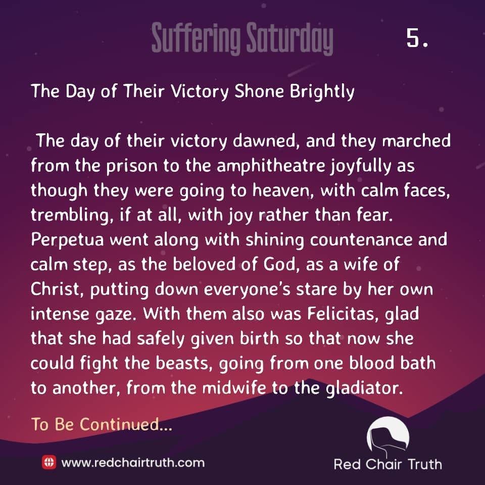 The day of their victory dawned, and they marched from the prison to the amphitheatre joyfully as though they were going to heaven, with calm faces, trembling, if at all, with joy rather than fear. Perpetua went along with shining countenance and calm step, as the beloved of God, as a wife of Christ, putting down everyone’s stare by her own intense gaze. With them also was Felicitas, glad that she had safely given birth so that now she could fight the beasts, going from one blood bath to another, from the midwife to the gladiator.