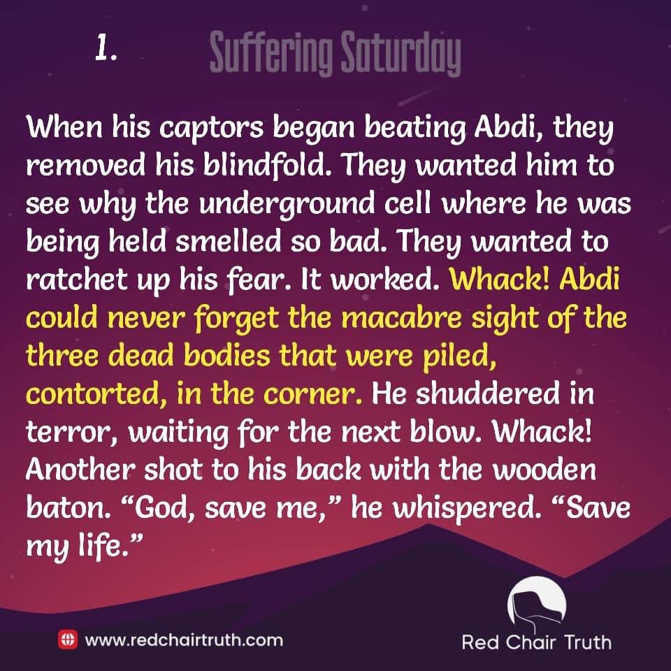 When his captors began beating Abdi, they removed his blindfold. They wanted him to see why the underground cell where he was being held smelled so bad. They wanted to ratchet up his fear. It worked. Whack! Abdi could never forget the macabre sight of the three dead bodies that were piled, contorted, in the corner. He shuddered in terror, waiting for the next blow. Whack! Another shot to his back with the wooden baton. “God, save me,” he whispered. “Save my life.”