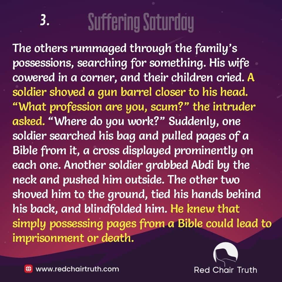 The others rummaged through the family’s possessions, searching for something. His wife cowered in a corner, and their children cried. A soldier shoved a gun barrel closer to his head. “What profession are you, scum?” the intruder asked. “Where do you work?” Suddenly, one soldier searched his bag and pulled pages of a Bible from it, a cross displayed prominently on each one. Another soldier grabbed Abdi by the neck and pushed him outside. The other two shoved him to the ground, tied his hands behind his back, and blindfolded him. He knew that simply possessing pages from a Bible could lead to imprisonment or death.
