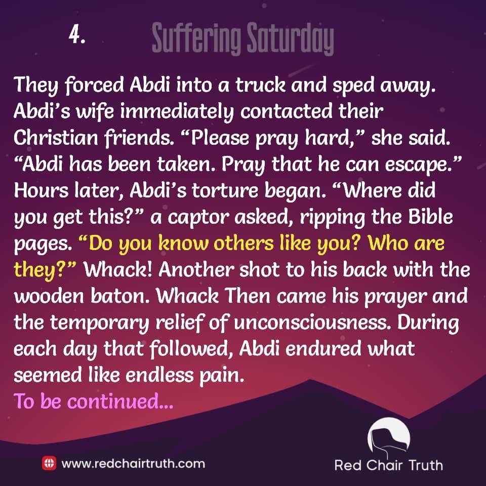 They forced Abdi into a truck and sped away. Abdi’s wife immediately contacted their Christian friends. “Please pray hard,” she said. “Abdi has been taken. Pray that he can escape.” Hours later, Abdi’s torture began. “Where did you get this?” a captor asked, ripping the Bible pages. “Do you know others like you? Who are they?” Whack! Another shot to his back with the wooden baton. Whack! Then came his prayer and the temporary relief of unconsciousness. During each day that followed, Abdi endured what seemed like endless pain.