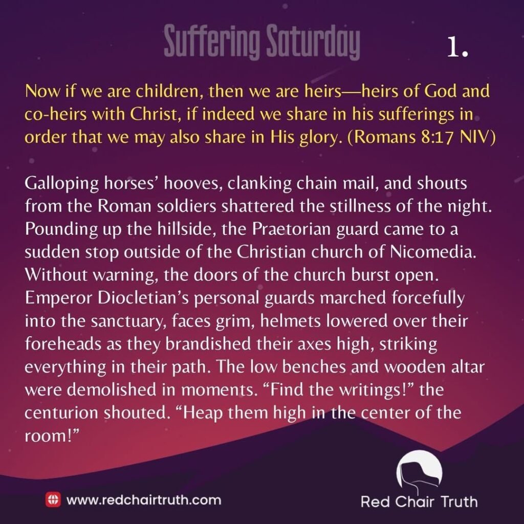 Galloping horses’ hooves, clanking chain mail, and shouts from the Roman soldiers shattered the stillness of the night. Pounding up the hillside, the Praetorian guard came to a sudden stop outside of the Christian church of Nicomedia. Without warning, the doors of the church burst open. Emperor Diocletian’s personal guards marched forcefully into the sanctuary, faces grim, helmets lowered over their foreheads as they brandished their axes high, striking everything in their path. The low benches and wooden altar were demolished in moments. “Find the writings!” the centurion shouted. “Heap them high in the center of the room!”