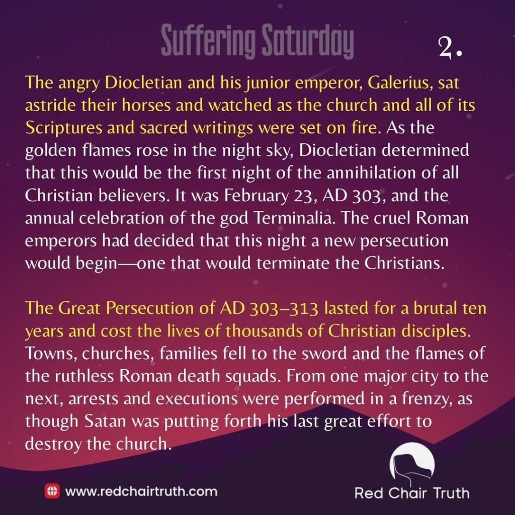 The angry Diocletian and his junior emperor, Galerius, sat astride their horses and watched as the church and all of its Scriptures and sacred writings were set on fire. As the golden flames rose in the night sky, Diocletian determined that this would be the first night of the annihilation of all Christian believers. It was February 23, AD 303, and the annual celebration of the god Terminalia. The cruel Roman emperors had decided that this night a new persecution would begin-one that would terminate the Christians.