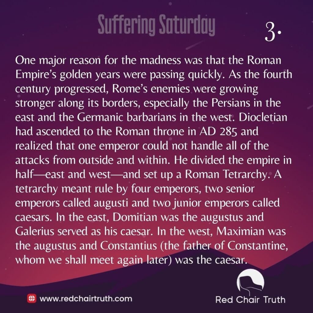 The Great Persecution of AD 303-313 lasted for a brutal ten years and cost the lives of thousands of Christian disciples. Towns, churches, families fell to the sword and the flames of the ruthless Roman death squads. From one major city to the next, arrests and executions were performed in a frenzy, as though Satan was putting forth his last great effort to destroy the church. One major reason for the madness was that the Roman Empire’s golden years were passing quickly. As the fourth century progressed, Rome’s enemies were growing stronger along its borders, especially the Persians in the east and the Germanic barbarians in the west. Diocletian had ascended to the Roman throne in AD 285 and realized that one emperor could not handle all of the attacks from outside and within. He divided the empire in half-east and west-and set up a Roman Tetrarchy. A tetrarchy meant rule by four emperors, two senior emperors called augusti and two junior emperors called caesars. In the east, Domitian was the augustus and Galerius served as his caesar. In the west, Maximian was the augustus and Constantius (the father of Constantine, whom we shall meet again later) was the caesar.