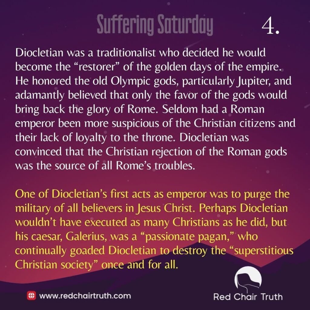 Diocletian was a traditionalist who decided he would become the “restorer” of the golden days of the empire. He honored the old Olympic gods, particularly Jupiter, and adamantly believed that only the favor of the gods would bring back the glory of Rome. Seldom had a Roman emperor been more suspicious of the Christian citizens and their lack of loyalty to the throne. Diocletian was convinced that the Christian rejection of the Roman gods was the source of all Rome’s troubles. One of Diocletian’s first acts as emperor was to purge the military of all believers in Jesus Christ. Perhaps Diocletian wouldn’t have executed as many Christians as he did, but his caesar, Galerius, was a “passionate pagan,” who continually goaded Diocletian to destroy the “superstitious Christian society” once and for all.