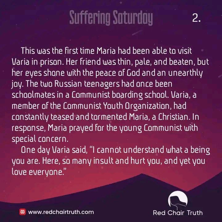 This was the first time Maria had been able to visit Varia in prison. Her friend was thin, pale, and beaten, but her eyes shone with the peace of God and an unearthly joy. The two Russian teenagers had once been schoolmates in a Communist boarding school. Varia, a member of the Communist Youth Organization, had constantly teased and tormented Maria, a Christian. In response, Maria prayed for the young Communist with special concern.