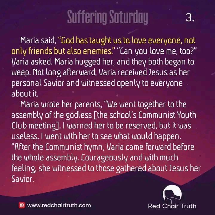 Maria wrote her parents, “We went together to the assembly of the godless [the school’s Communist Youth Club meeting]. I warned her to be reserved, but it was useless. I went with her to see what would happen. “After the Communist hymn, Varia came forward before the whole assembly. Courageously and with much feeling, she witnessed to those gathered about Jesus her Savior.