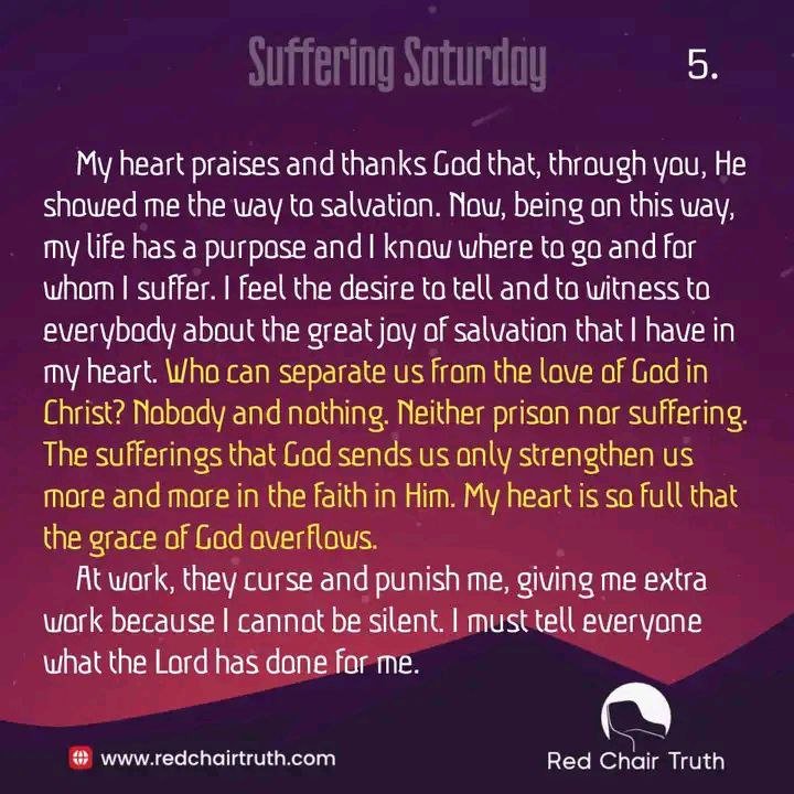 “No,” she answered. “And if they would free me, I would do it again and would tell them about the great love of Jesus. Don’t think that I suffer. I am very glad that the Lord loves me so much and gives me the joy to endure for His name.”