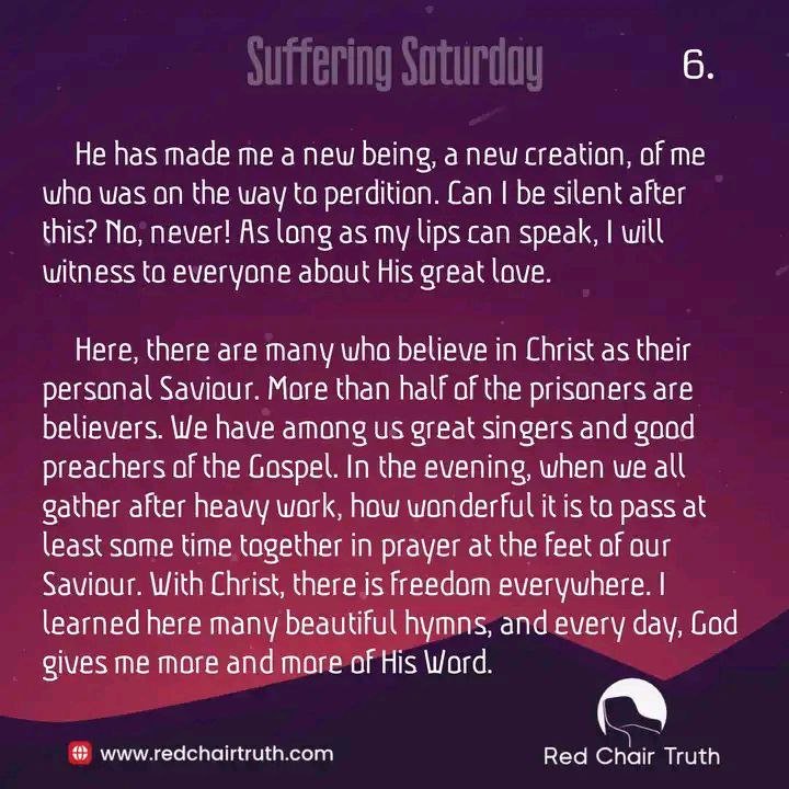 Here, there are many who believe in Christ as their personal Saviour. More than half of the prisoners are believers. We have among us great singers and good preachers of the Gospel. In the evening, when we all gather after heavy work, how wonderful it is to pass at least some time together in prayer at the feet of our Saviour. With Christ, there is freedom everywhere. I learned here many beautiful hymns, and every day, God gives me more and more of His Word.