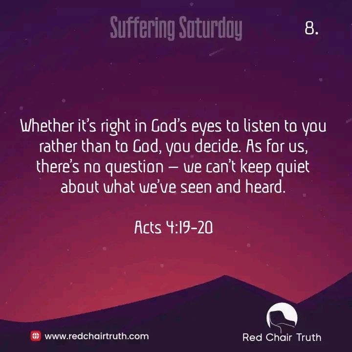 Whether it’s right in God’s eyes to listen to you rather than to God, you decide. As for us, there’s no question – we can’t keep quiet about what we’ve seen and heard. Acts 4:19-20.