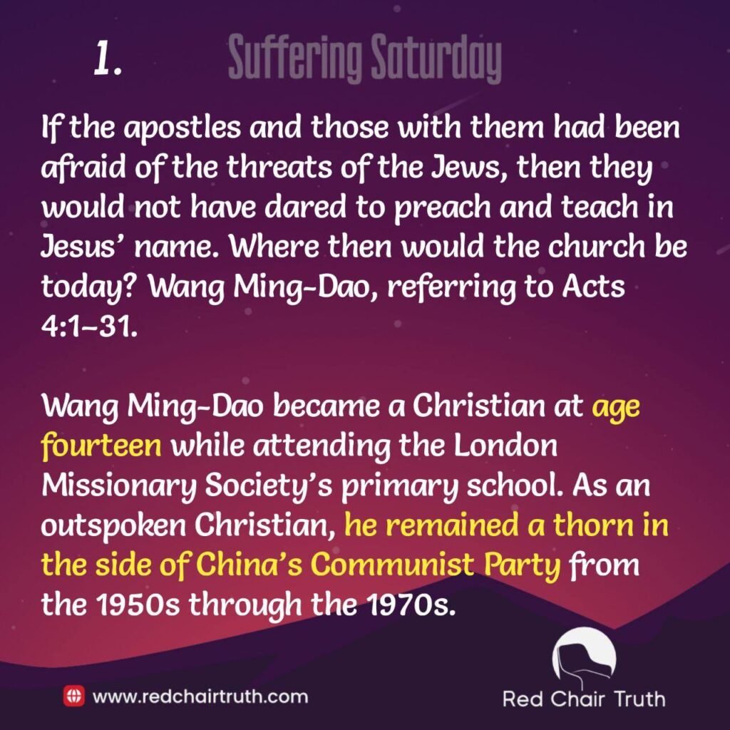 If the apostles and those with them had been afraid of the threats of the Jews, then they would not have dared to preach and teach in Jesus’ name. Where then would the church be today? Wang Ming-Dao, referring to Acts 4:1-31. Wang Ming-Dao became a Christian at age fourteen while attending the London Missionary Society’s primary school. As an outspoken Christian, he remained a thorn in the side of China’s Communist Party from the 1950s through the 1970s.