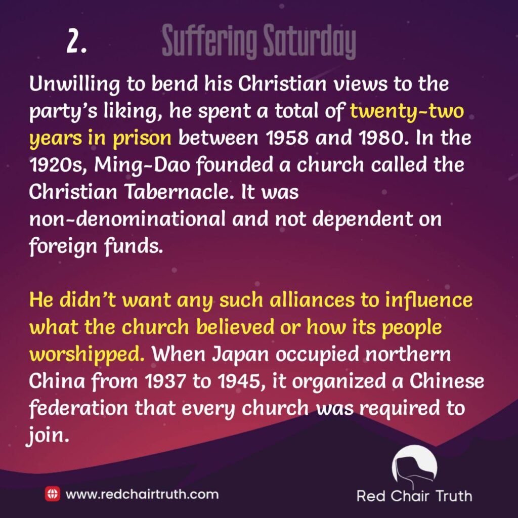 Unwilling to bend his Christian views to the party’s liking, he spent a total of twenty-two years in prison between 1958 and 1980. In the 1920s, Ming-Dao founded a church called the Christian Tabernacle. It was non-denominational and not dependent on foreign funds. He didn’t want any such alliances to influence what the church believed or how its people worshipped. When Japan occupied northern China from 1937 to 1945, it organized a Chinese federation that every church was required to join. Ming-Dao refused, putting his life on the line. The federation threatened him, but he stood nose to nose with the Japanese imperialists. He believed it was wrong to form an alliance that included nonbelievers.