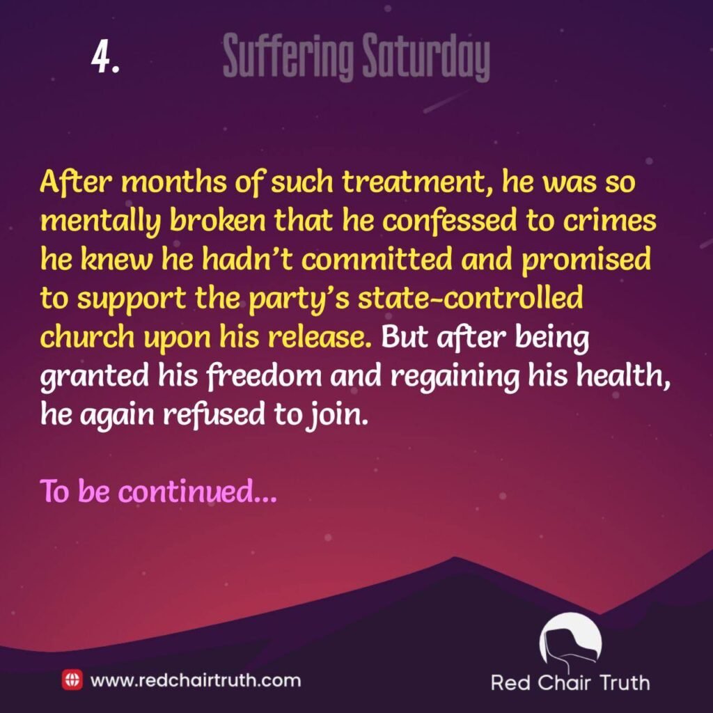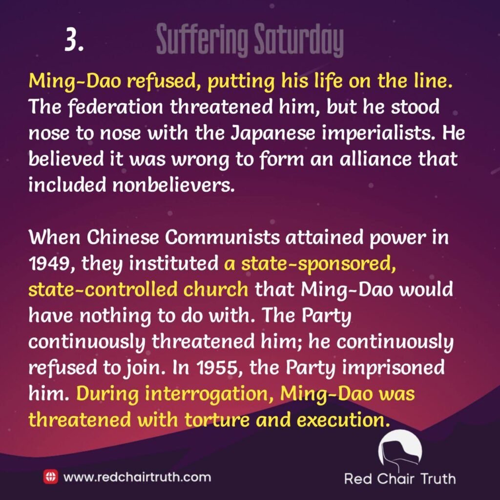 When Chinese Communists attained power in 1949, they instituted a state-sponsored, state-controlled church that Ming-Dao would have nothing to do with. The Party continuously threatened him; he continuously refused to join. In 1955, the Party imprisoned him. During interrogation, Ming-Dao was threatened with torture and execution. After months of such treatment, he was so mentally broken that he confessed to crimes he knew he hadn’t committed and promised to support the party’s state-controlled church upon his release. But after being granted his freedom and regaining his health, he again refused to join.