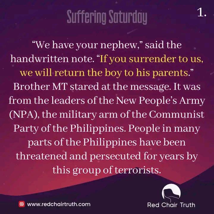 “We have your nephew,” said the handwritten note. “If you surrender to us, we will return the boy to his parents.” Brother MT stared at the message. It was from the leaders of the New People’s Army (NPA), the military arm of the Communist Party of the Philippines. People in many parts of the Philippines have been threatened and persecuted for years by this group of terrorists.