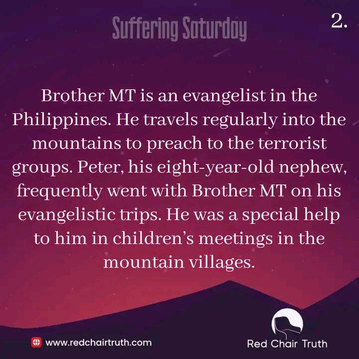 Brother MT is an evangelist in the Philippines. He travels regularly into the mountains to preach to the terrorist groups. Peter, his eight-year-old nephew, frequently went with Brother MT on his evangelistic trips. He was a special help to him in children’s meetings in the mountain villages.