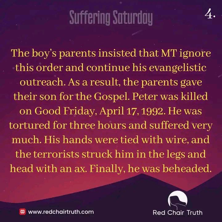 He knew there was no hope that his surrender would save his nephew. He knew they would both be killed; still, he hesitated. The boy’s parents insisted that MT ignore this order and continue his evangelistic outreach. As a result, the parents gave their son for the Gospel. Peter was killed on Good Friday, April 17, 1992. He was tortured for three hours and suffered very much. His hands were tied with wire, and the terrorists struck him in the legs and head with an ax. Finally, he was beheaded.