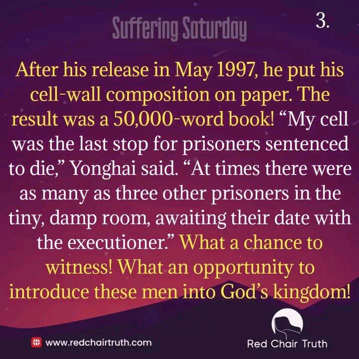 After his release in May 1997, he put his cell-wall composition on paper. The result was a 50,000-word book! “My cell was the last stop for prisoners sentenced to die,” Yonghai said. “At times there were as many as three other prisoners in the tiny, damp room, awaiting their date with the executioner.” What a chance to witness! What an opportunity to introduce these men into God’s kingdom!