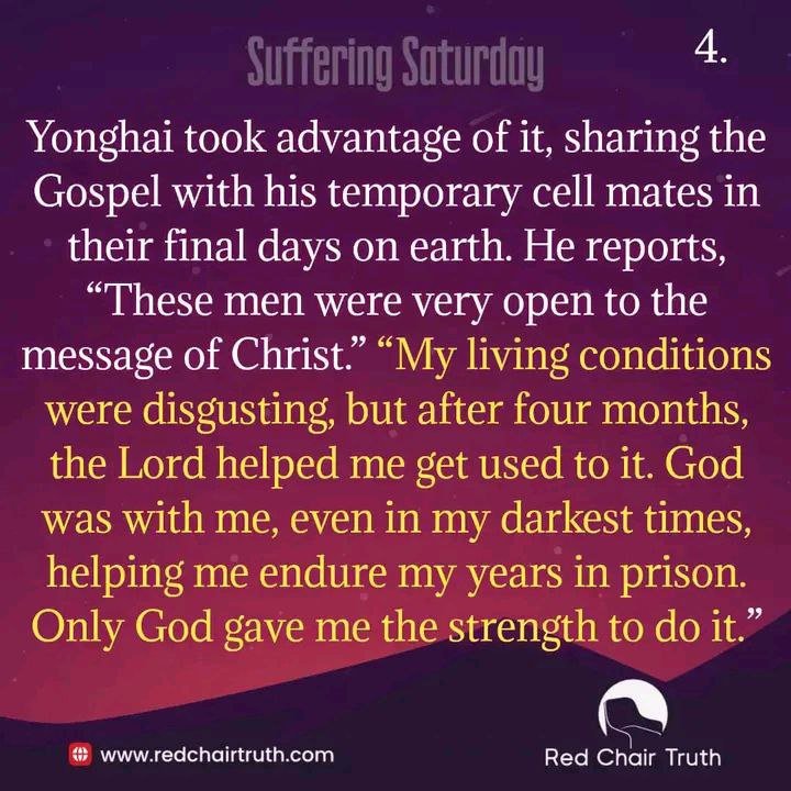 Yonghai took advantage of it, sharing the Gospel with his temporary cell mates in their final days on earth. He reports, “These men were very open to the message of Christ.” “My living conditions were disgusting, but after four months, the Lord helped me get used to it. God was with me, even in my darkest times, helping me endure my years in prison. Only God gave me the strength to do it.”