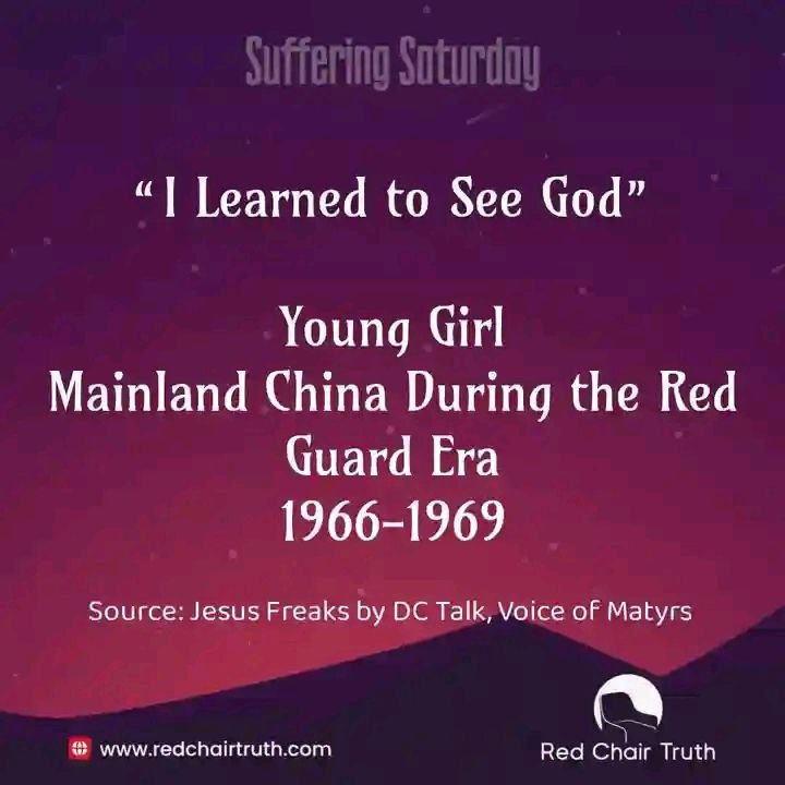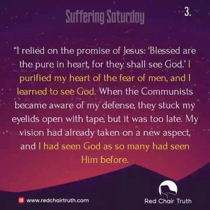 “I relied on the promise of Jesus: ‘Blessed are the pure in heart, for they shall see God.’ I purified my heart of the fear of men, and I learned to see God. When the Communists became aware of my defense, they stuck my eyelids open with tape, but it was too late. My *vision had already taken on a new aspect, and I had seen God as so many had seen Him before.
