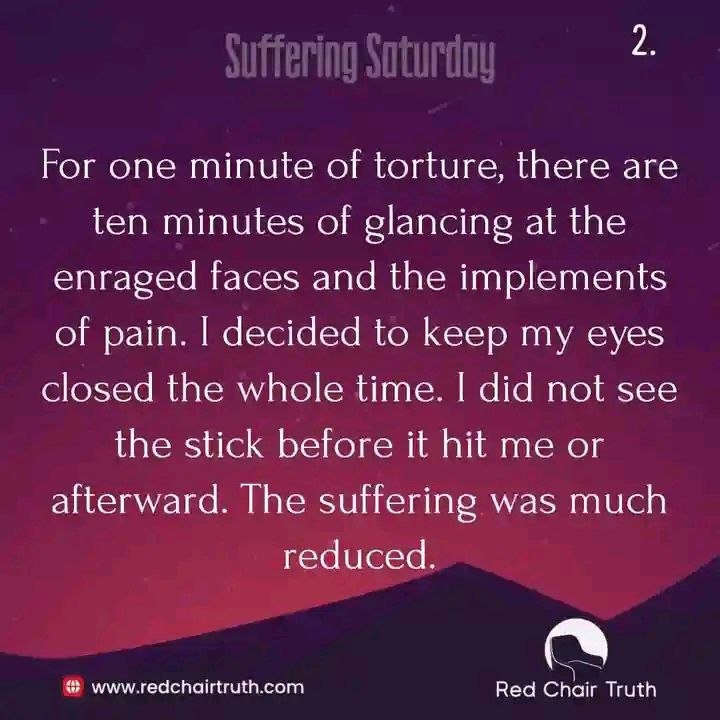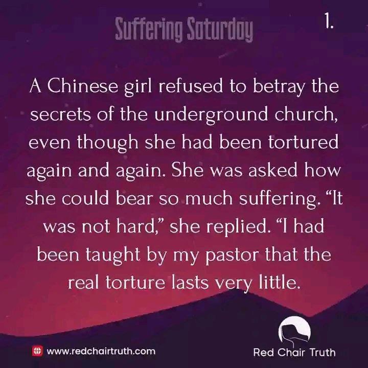 A Chinese girl refused to betray the secrets of the underground church, even though she had been tortured again and again. She was asked how she could bear so much suffering. “It was not hard,” she replied. “I had been taught by my pastor that the real torture lasts very little. For one minute of torture, there are ten minutes of glancing at the enraged faces and the implements of pain. I decided to keep my eyes closed the whole time. I did not see the stick before it hit me or afterward. The suffering was much reduced.